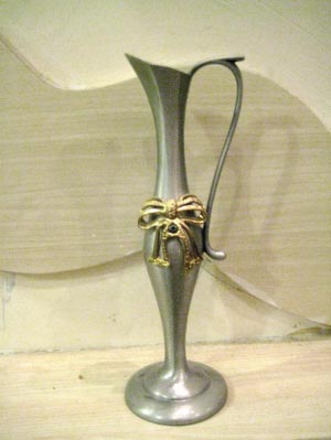 這不是花瓶也不是水壺,而是來自外蒙古的錫制燭臺。店主介紹,這款燭臺受俄羅斯風(fēng)格影響,所以有明顯的西式風(fēng)味。整體圓弧設(shè)計圓潤,金色的綬帶式的設(shè)計給整個冷色調(diào)增添了生動。