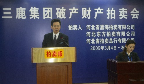 3月4日 “三鹿集團(tuán)”破產(chǎn)首次拍賣會(huì):三元以總價(jià)61650萬元成功競(jìng)拍 3月4日,拍賣師主持“三鹿集團(tuán)”破產(chǎn)首次拍賣會(huì)。當(dāng)天上午,石家莊三鹿集團(tuán)股份有限公司(“三鹿集團(tuán)”)破產(chǎn)首次拍賣會(huì)在河北省石家莊市中級(jí)人民法院審判庭舉行。最終,北京三元集團(tuán)有限責(zé)任公司與河北三元食品有限公司組成的聯(lián)合競(jìng)拍體以61650萬元人民幣的價(jià)格競(jìng)拍成功。 新華社發(fā)(丁立新 攝)