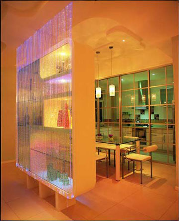 展示架也非常適合用來(lái)劃分客廳和餐廳空間。在這個(gè)案例中,充滿時(shí)尚、動(dòng)感造型的展示架不著痕跡地發(fā)揮著自己的分隔作用,同時(shí),又能與被分開的兩個(gè)空間完美融合,不顯突兀。為了增強(qiáng)裝飾效果,帶有發(fā)光效果的線簾也被運(yùn)用了進(jìn)來(lái),讓這處空間充滿了設(shè)計(jì)感,顯得新穎而獨(dú)特。