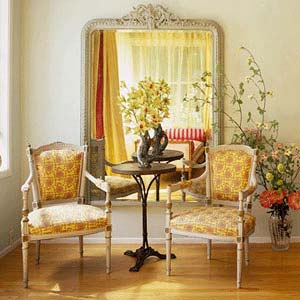 起居室的墻壁上低低地懸掛著老式穿衣鏡,鏡中照出對面的兩用坐臥長椅、黃色帷帳和三腳架茶幾,再搭配上兩把30年代款式經(jīng)典的古董法式座椅,使這個角落充滿了懷舊氣息。絲綢帷帳和棉布椅套也銜接得恰到好處。