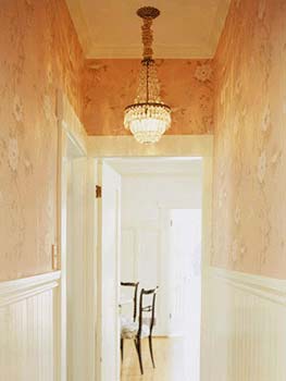 橙粉色的墻紙使走廊充滿浪漫氣息。線條流暢的壁板使空間顯得簡潔寬敞,合適的高度避免了手指弄臟精美的墻紙。古老的枝型水晶吊燈成為了走廊的亮點,使視線自然地轉(zhuǎn)移過來。建議在黑暗的走廊里懸掛水晶吊燈或淺粉色的燈泡,增添浪漫氣息。