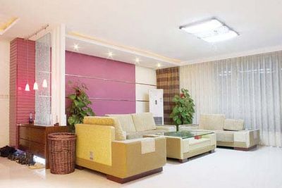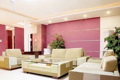 紫色背景墻最常用的地方是沙發(fā)背景墻。用紫色壁紙大面積鋪帖,只在柜式空調(diào)的后面留出相應的白色部分,再用銀色金屬條橫著粘貼在壁紙上,既能保證整體色調(diào)的完整,又不會死板,而且銀色也是一種很高檔的顏色,整體看來很有品位。值得注意的是家具一定要選擇淺色的,不然客廳就會顯得很暗。