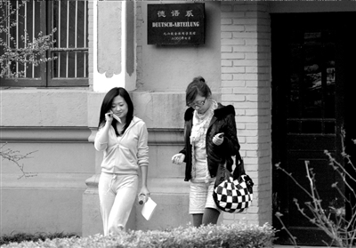 和之前進(jìn)德語(yǔ)系辦公樓時(shí)嚴(yán)肅的神情相比,王亭亭(左)出辦公樓時(shí)的表情明顯輕松了很多。本報(bào)記者朱嘉磊 攝