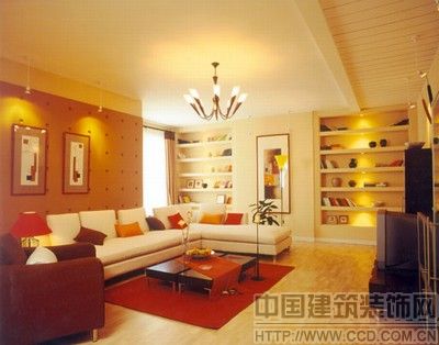 客廳的三面墻用淡黃色乳膠漆處理,家具的選擇以白色為主,配以紅白相間的沙發(fā)。因?yàn)榭蛷d面積較大,所以選擇了寬大的多人沙發(fā),與旁邊的單個(gè)沙發(fā)椅形成了L形布局,沙發(fā)后面的墻壁設(shè)計(jì)了反射燈作為局部光源,沙發(fā)與電視柜的距離較遠(yuǎn),這樣無(wú)論是休息還是觀看節(jié)目都非常舒服。