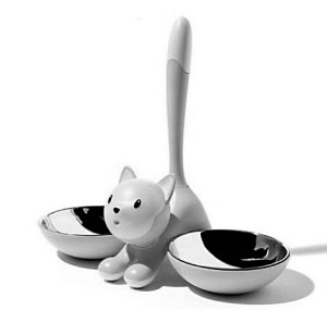 一只準(zhǔn)備開(kāi)跑的小貓身邊放著兩個(gè)盤子。從貓的表情到直豎的尾巴再到流線設(shè)計(jì)的食盆,做工都相當(dāng)精致,只有家有愛(ài)寵的人才能如此貼心地專門為貓咪打造這樣一個(gè)食盆。