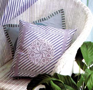 將一個機織的帶有花邊的蕾絲圖案縫在靠墊前面,可以緩和條紋靠墊的線條,而靠墊的狹長條紋又恰巧為蕾絲提供了一個天然的相框。