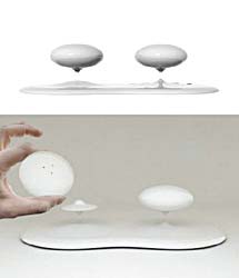 這其實(shí)是一只磁懸浮調(diào)料瓶,它的整體被設(shè)計(jì)成白色,共有三個(gè)部分:調(diào)料瓶、底座與基座。兩個(gè)橢圓形的調(diào)料瓶被安放在磁體支撐的小巧底座上,而這兩個(gè)小巧的底座通過與基座之間的磁力作用懸浮在空中從而起到對(duì)調(diào)料瓶的支撐作用。
