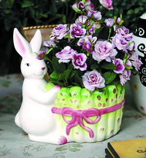 小白兔應(yīng)該是愛(ài)花族吧,和鮮花形成美妙的組合。兔子含笑地捧著花盆,仿佛在展示著花朵的美麗,也在展示自己的可愛(ài)。此款花瓶最適合可愛(ài)的女生,擺在書(shū)桌上或是化妝鏡前,一定會(huì)帶來(lái)意想不到的生動(dòng)。