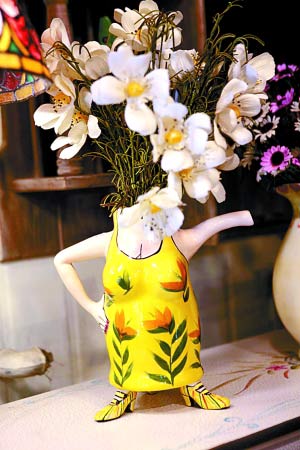 著長(zhǎng)裙的婦女明顯發(fā)福,明黃色的裙子讓身材更加“凹凸”,而一手叉腰,一手舉起的姿勢(shì)仿佛在表現(xiàn)著什么。這個(gè)可愛(ài)的“女人”頭上就是插花口,就算放入一束簡(jiǎn)單的花,也能給觀者帶來(lái)不錯(cuò)的心情。