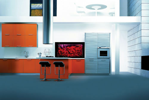 煙機不過是最常見的廚房道具,但在這里,復式的房子,為長型的煙機提供了展現(xiàn)自我的場地,不僅能把功能發(fā)揮到極致,更能成為最引人注目的裝飾品。如果你有足夠的創(chuàng)意,不妨還可以像這樣把大型魚缸搬到廚房來,讓他們營造出更前衛(wèi)的效果。