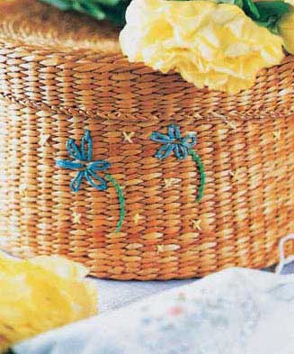 用藤條編織的收納籃子,紋路清晰明了,并且有空隙,所以很容易在上面繡上各種圖案?;@子上的花朵和細枝,以及細密的十字形點綴圖案繡法都十分簡單易行。如果家中有這種編織方式的籃子,可以嘗試用這種方法裝飾一下。