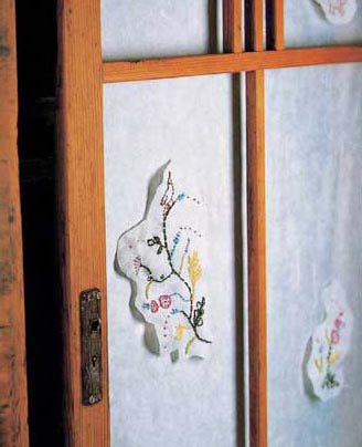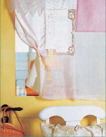 制作簾子時最好選擇稍薄的材料,準備大小不同的幾塊布料,分別繡上需要的圖案。最后,用針線將布料縫綴成為簾子就可以了。如果覺得刺繡有點困難的話,可以利用已經(jīng)繡有圖案的手帕,也不失為一種好方法。