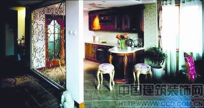 由于廚房門前的空間較小,如果使用墻體或其他厚重材質(zhì)將其與門廳分隔,難免會使此空間顯得太壓抑,因此使用了金色鏤空鐵藝作為隔斷。和屋內(nèi)實木整體厚重的感覺相比,鐵藝產(chǎn)品借鑒歐洲古羅馬時期純樸、質(zhì)感的加工工藝,與現(xiàn)代精湛的鍛造手段相結(jié)合,制造出具有歐洲古典風格且蘊涵現(xiàn)代氣息的隔斷,既有效地區(qū)分了功能區(qū),又充滿輕盈通透的美感,而且鐵藝的質(zhì)感、線條、造型與居室整體的歐式風格也非常協(xié)調(diào),并且使廚房門前的狹小空間也得到了充分利用,成為一個西式餐區(qū)。