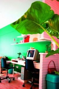 一進(jìn)門便是一片醉心的綠,那是沙發(fā)的背景墻??闯鑫覀冄劾锏捏@訝,蘇珊得意地說:“小時(shí)候在林區(qū)生活過,對綠色有著不能釋懷的愛戀??紤]到工作臺(tái)設(shè)在客廳,暗啞的綠符合我內(nèi)斂的性格,也兼顧了眼睛的舒適。說起來挺有趣,當(dāng)初去調(diào)顏色時(shí),商家聽說用這么大桶的綠去漆客廳,說什么也不肯賣,我再三保證決不會(huì)來退貨他才肯賣呢!”