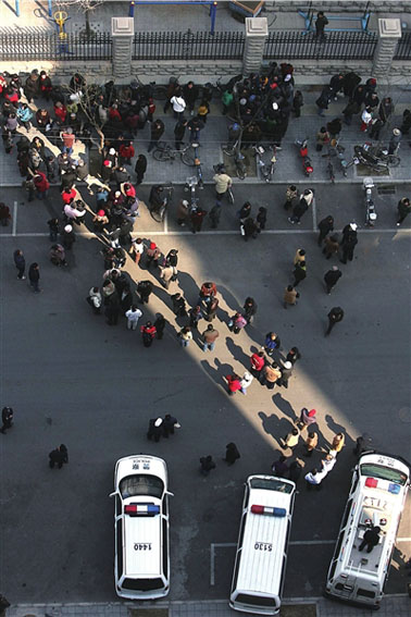 清晨天冷,很多趕來的受害者集中在樓間透出的陽光下。(來源:京華時報)