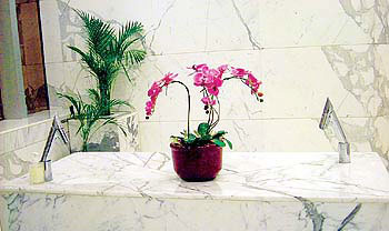 “水落石出”有乾坤如果不是有個水龍頭,乍看上去,記者還真不知道原來這是洗手盆!洗手盆的表面幾乎是平的,洗手盆中間放著一盆花,上面有兩個水龍頭,除此之外,別無他物。記者仔細觀察后發(fā)現(xiàn)看似平整的表面有那么一丁點兒向中間傾斜,水流流到中間的花盆便“消失”了。