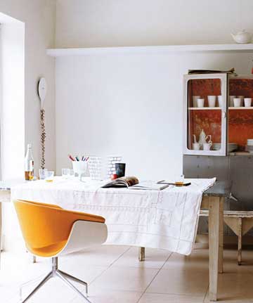 一把極具風(fēng)格的橙色椅子和橙色材質(zhì)的櫥柜使實用的廚房凸顯性格。精致的亞麻提花的舊桌布既遮蓋了有些磨損的桌面又給廚房帶來些許溫和雅致的氣質(zhì)?,F(xiàn)在廚房在不做飯時,也可以被用來看書或者思考了。