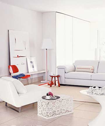 加入一些紅色元素使房間充滿現(xiàn)代感。一把經(jīng)典的餐桌椅,一個詭異的圓凳,一些細(xì)微而別致的鮮紅色裝飾;紅色的電話,話筒卻可以是白色,素色地毯的四邊只有一邊是紅色,白色裝飾畫,用剪開的方式呈現(xiàn)出內(nèi)部的紅色,紅色以不同的方式和形態(tài)出現(xiàn),引人注目卻又不喧賓奪主。