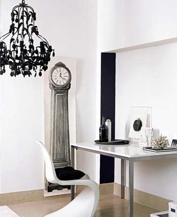 用混搭的風(fēng)格來更新經(jīng)典的黑白搭配。一條簡單的黑色長條色塊增加了角落的深度,本來容易被忽視的角落反而成為了居室里的亮點。其它配飾的選擇除了顏色非黑即白之外,最好選擇不同的材質(zhì)和質(zhì)地,這樣就會有既豐富又單純的效果。