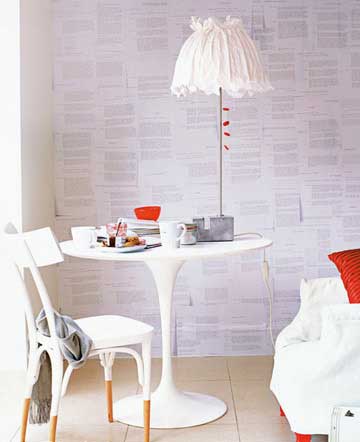 用復(fù)印的文稿裝飾個性墻面。將墻面涂滿膠水,然后粘上文稿。不要過于擔(dān)心是否整齊,不規(guī)則更增添其吸引力,其他的小工藝還包括用彩紙包裹椅子腿,或者在粉刷家具時,故意留下一部分,以及將臺燈的拉繩點綴上紐扣,而選擇紅色靠包可能是最簡單易行的調(diào)色方法了。