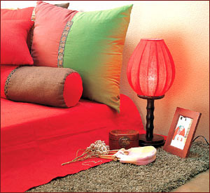 在面料選擇上,絲綢最能體現(xiàn)幽雅的古意,但其實一些經(jīng)過特殊加工的棉布也是很不錯的選擇。一款具有中國民俗風(fēng)情的緞面抱枕極富女人味,那光滑冰涼的綢緞仿似美人的肌膚,輕軟的真絲煥發(fā)出柔美的光澤。另一款抱枕底色是深褐色,上面隱隱能看見些許暗花紋,但又看不確切,給人留下了豐富的想象空間;米白的波浪形邊紋柔柔地纏繞在四周,就像美女溫柔的微笑,含蓄清雅、回味無窮。