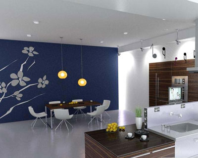 以暖色為基調(diào),墻面是淡桔色,地面為暖色的地毯,桌面可飾紅色的布藝,飾品柜中可擺插花、燭臺、餐具、酒杯等各顯其色。窗簾和室內(nèi)其他布飾多采用大花織物。窗臺上可點(diǎn)綴些綠植。五彩的燈光與墻面抽象的裝飾畫呼應(yīng)。
