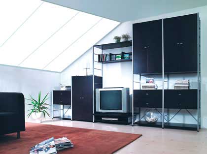 鋼木組合架線條明快、風格簡約,多功能組合架成了電視背景墻,這種做法非常適合小戶型。但組合架最好有開有合,關閉的柜門或抽屜可以放置書籍、CD、雜物等零亂的東西,樣式美觀的書籍或裝飾品放在外面展示,這樣才不會讓視覺過于擁擠。
