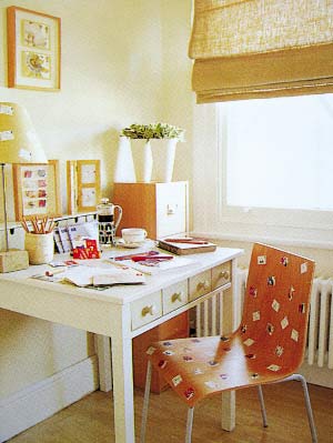 ——輕快玲瓏色調(diào)。中心色為黃、橙色。地毯橙色,窗簾、床罩用黃白印花布,沙發(fā)、天花板用灰色調(diào),加一些綠色植物襯托,氣氛別致。