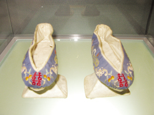 此次還展出了兩雙旗鞋,稱“高底鞋”,由于形似花盆,也有稱為“盆底鞋”,還有的像馬蹄,稱“馬蹄底鞋”。記者發(fā)現(xiàn)“高底鞋”都較大,但木跟高達10厘米。袁榮解釋說:“滿族婦女不纏足,他們自古有‘削履’的習俗,冰雪天穿草鞋防滑。其余時間則穿木底鞋,以便在疏松的土地上活動。鞋跟是用白細布裱蒙,鞋面用刺繡、穿珠制作??赡苁撬麄兇┍缎木壒剩源┻@么高的鞋也習慣了。”慈禧太后穿的高底鞋比較特別,把鞋頭做成一個鳳頭形,嘴銜珠穗,因此稱為“鳳頭鞋”。