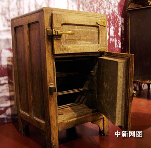 圖為溥儀用過的西式木制冰箱,將冰塊放入冰箱上層,即可為儲存在冰箱下層的食物保鮮