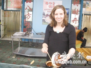 “我先來,是這里的地主?!避噭P茜說,開餃子店幾年來,她學(xué)會(huì)了怎樣與菜市場(chǎng)的小商小販討價(jià)還價(jià),學(xué)會(huì)了怎樣招徠顧客。其他老外初入洋人街開店,她主動(dòng)幫忙,給他們當(dāng)翻譯等。為給新來的老外“扎場(chǎng)子”,她還經(jīng)常組織朋友去照顧生意。