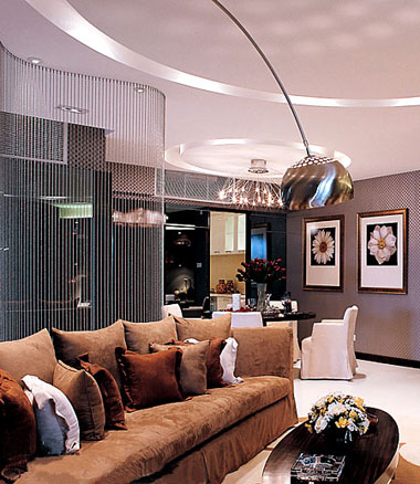 餐廳與客廳用圓形的天花燈槽增強(qiáng)了空間的獨(dú)立感,弧形的座燈與圓點(diǎn)圖案的地毯令整個(gè)空間氣氛沉靜卻不失活潑。臨空而懸的水晶珠簾是客廳的生輝妙筆,把飯廳與客廳區(qū)分開來,然而有隱約可見對(duì)方,給居室布置了一種隔而不斷的布局。