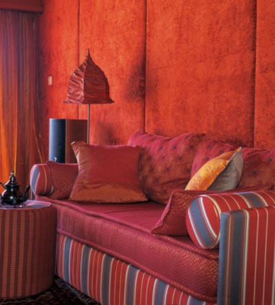 墻壁在我們通常的印象中都是堅(jiān)硬和冰冷的。如果你想要一個(gè)徹頭徹尾柔軟溫暖的客廳,這應(yīng)該是個(gè)不錯(cuò)的方法:沙發(fā)后面的主題墻用軟包的手法來處理,面料要選加厚絨面的 ,色彩自然是暖色系,暗橘色使得空間看起來又溫暖又有年代感,有些祖母家的懷舊味道,采用與墻面同色系的軟裝飾和沙發(fā),質(zhì)地同樣要厚重柔軟,放幾個(gè)松軟的靠包是必不可少的。