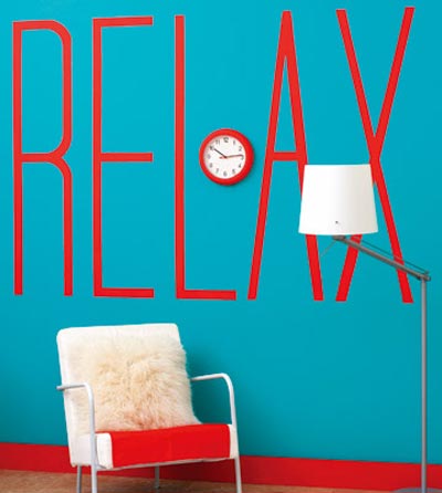 這樣讓人眼前一亮的空間實(shí)施起來,需要的是你靈機(jī)一動(dòng)的好點(diǎn)子,藍(lán)色的乳膠漆墻面像海面一樣寧靜,空間似乎有些單調(diào),選一種不太張揚(yáng)的紅色漆,用涂鴉的方式在墻上畫出RELAX的圖案,作為呼應(yīng),踢腳線也涂刷同樣顏色的漆,最精彩的是找到一款同色的鐘表點(diǎn)綴其間,配上簡(jiǎn)潔的家具、配飾,如同海報(bào)一樣的畫面出現(xiàn)了,制造一個(gè)放松而趣味橫生的客廳就是這樣簡(jiǎn)單。