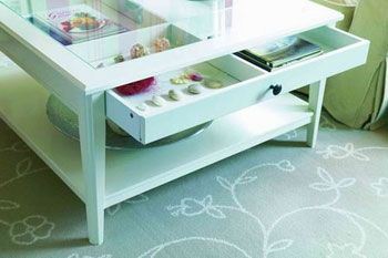 茶幾的透明桌面下可以帶一個(gè)分成好幾格的抽屜,把漂亮的雜志還有原先雜亂無章擺放的小飾品放在里面。這一招不僅讓客廳空間變得干凈整潔,美化了茶幾,還為你的小飾品找到了獨(dú)特的“展臺(tái)”。