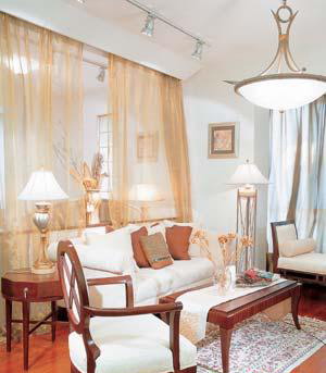 主照明提供客廳空間大面積的光線,通常擔(dān)任此任務(wù)的是光源來自上方的吊燈或吸頂燈,依居住者喜好的風(fēng)格可以有不同的搭配,如氣派豪華的雪花石吊燈、水晶燈、手工玻璃燈是不錯(cuò)的選擇。若以歐洲的燈具設(shè)計(jì)為例,北歐風(fēng)格簡(jiǎn)潔沉穩(wěn)、適合極簡(jiǎn)主義之流的搭配;講求設(shè)計(jì)感和質(zhì)感的意大利設(shè)計(jì),則和后現(xiàn)代風(fēng)格互相輝映;奧地利或愛爾蘭的水晶燈具,恰如其分地與新古典、維多利亞風(fēng)格相結(jié)合;西班牙的粗礦原石,在作品完成后,卻是高貴奢華的代表。