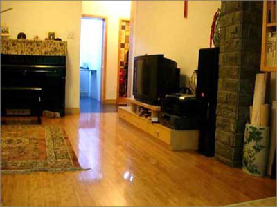 青磚處原本是客臥的間隔墻。敲掉后將臥室向里移了1米多,抬高做了地臺。梁不能敲,干脆帖上青磚,算客廳和餐廳的隔籪斷。