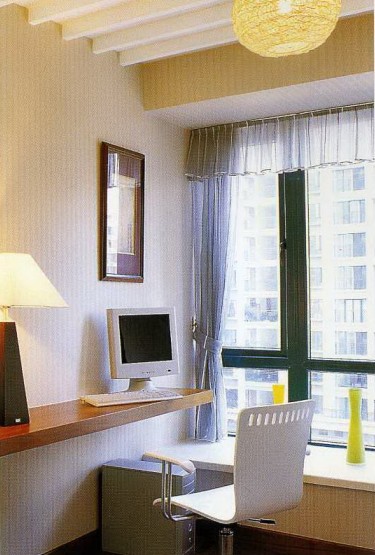 明:書房的照明與采光書房作為主人讀書寫字的場所,對于照明和采光的要求很高。因?yàn)槿搜墼谶^強(qiáng)或過弱的光線中工作,都會對視力產(chǎn)生很大的影響,所以寫字臺最好放在陽光充足,但不直射的窗邊。這樣,在工作疲倦時(shí)可從窗遠(yuǎn)眺,休憩養(yǎng)神。書房內(nèi)一定要設(shè)有臺燈和書柜專用射燈,便于主人閱讀和查找書籍。臺燈的光線要均勻地照射在讀書寫字的地方,不宜離人太近,以免強(qiáng)光刺眼。長臂臺燈特別適合書房照明。