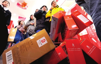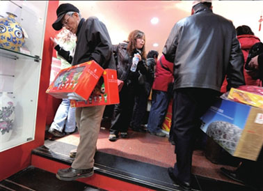 據(jù)工美旗艦店工作人員介紹,自上周開(kāi)始,商場(chǎng)對(duì)所售奧運(yùn)商品打折促銷(xiāo),顧客就開(kāi)始逐漸增多,直至上周末達(dá)到高峰,日均客流量是平常的數(shù)倍?!艾F(xiàn)在打折力度很大,很多人一次買(mǎi)很多東西?!痹趯?zhuān)賣(mài)店內(nèi),各柜臺(tái)前擠滿(mǎn)了顧客,柜臺(tái)內(nèi)的售貨員不停地為顧客取貨,開(kāi)票幾乎騰不出空回答問(wèn)題。