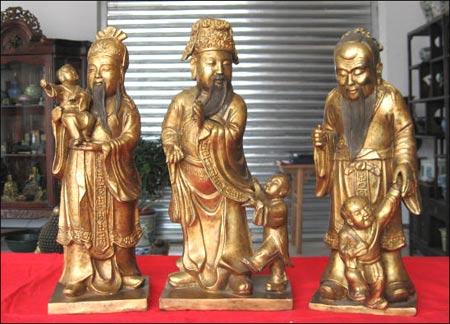 ?。?)福祿壽三星:“福星”手抱小兒,象征有子萬事足的福氣?!暗撔恰鄙泶┤A貴朝服,手抱玉如意,象征加官進(jìn)爵,增財(cái)添祿?!皦坌恰笔峙鯄厶遥媛缎腋O楹偷男θ?,象征安康長(zhǎng)壽。福祿壽三星中,本來只有“祿星”才是財(cái)神;但因?yàn)槿峭ǔJ侨灰惑w,故此福、壽二星也因而被人一起視為財(cái)神供奉了。倘若把福、祿、壽三星擺放在財(cái)位內(nèi),有這三星拱照,滿堂吉慶,撇開風(fēng)水不談,單是視覺上及心理上也會(huì)覺得十分舒服的。擔(dān)任文職的,以及受雇打工的人均宜擺放或供奉文財(cái)神;至于那些經(jīng)商做老板,以及當(dāng)兵當(dāng)差從事武職的人,則應(yīng)該擺放或供奉武財(cái)神。