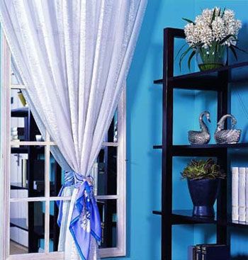 天鵝與湖藍(lán)色的墻面,制造了具有童話意味的夢(mèng)幻角落。藍(lán)色絲巾挽住潔白的窗簾,搭配出女性的精神力量。