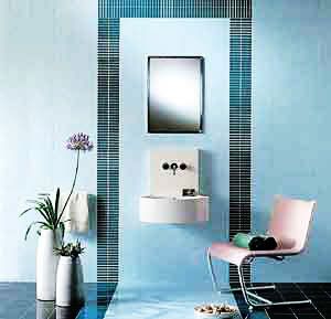 面積稍小的衛(wèi)浴間,由于空間比較局促,無(wú)法安排下淋浴房或浴缸,一個(gè)簡(jiǎn)單的淋浴花灑即構(gòu)成淋浴區(qū),即便如此,這個(gè)簡(jiǎn)單的小淋浴區(qū)也同樣可以使用彩磚+花磚的辦法,亮麗起來(lái)。