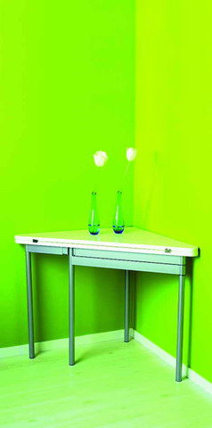 墻角往往是一個被人們忽略的角落,其實只要選擇了合適的家具,墻角也能“變廢為寶”。一個可以沿對角線折疊的小方桌是你改造墻角的好幫手。折疊起來后,它就變成了富有情趣的小角桌,在使用的同時,還可以裝飾墻角。展開后,它就成了小方桌,吃飯、工作時都可以使用。
