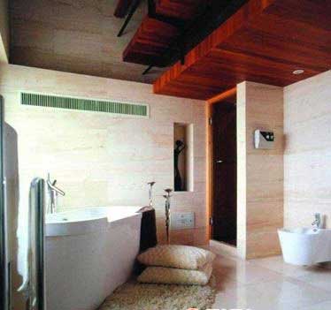雖然用了毛茸茸的地毯彌補(bǔ)這種冰涼,可并沒(méi)有多少分量。所以,在浴室的一角,桑拿房為浴室增添了溫暖,在浴室的建造中,穩(wěn)重的石材與親和的木材是個(gè)性各異,但卻同屬自然材質(zhì)一族,所以視覺(jué)上會(huì)有一種新鮮感,但觸感和情感上卻容易保證和諧。