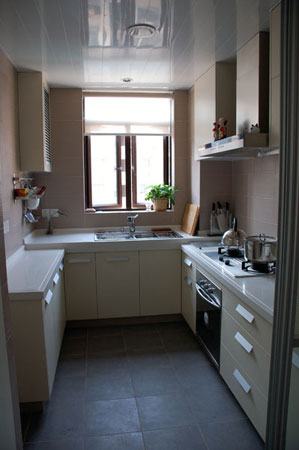 麻雀雖小五臟俱全,小戶型房子的裝修也是同理。老房需要補充的內(nèi)容很多,首先電線要全部更換,并按新功能要求重新布線,包括電視、電話的合理布置等。經(jīng)過各種做法比較和結(jié)合現(xiàn)場情況,地面電線全部走木地板的木龍骨縫隙里。頂棚原燈具舍棄,局部淺吊頂8厘米,利用吊頂造型和燈光營造大空間里的小空間。暗廳內(nèi)做大面積鏡面,使得暗廳舒展敞亮,擴大空間,暗廳不暗,小中見大,鏡子面下沿與桌面同高,選購折疊三角桌,三角長邊對鏡放置,利用鏡面效果空間看上去是“方桌”45度斜放,而兩把椅子也變成“四把”了。墻面的鏡子正對滿墻面貯藏柜,大鏡子正好起到穿衣鏡的作用。這個廳完成后的效果唬住了很多人,鄰居到家里來,驚訝地說:“你家不是和我家同一個戶型嗎,怎么廳這樣大呢?”