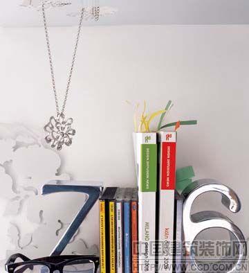 在兩層收納架上,上層的鏤空設(shè)計(jì)改變了兩層分別獨(dú)立存在的單調(diào)格局,一條大花朵造型的項(xiàng)鏈貫穿其中,顯得活潑而別致。而字母造型的書擋將文件夾與CD光盤歸整到一起,不僅僅有收納之用,更顯出實(shí)用之外的美麗趣味。