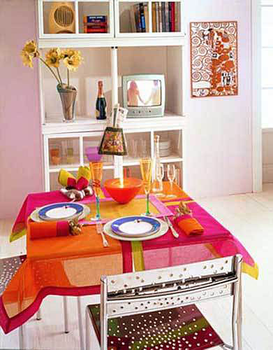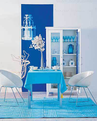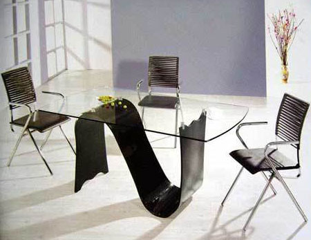 點(diǎn)綴:利用玻璃桌面反射的特點(diǎn),改變周?chē)h(huán)境的色彩和紋理,就能間接地改變餐桌的個(gè)性。色澤柔和的餐布和餐具,立即使這款過(guò)于理性化的餐桌椅變得溫馨起來(lái)。