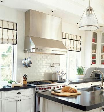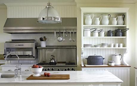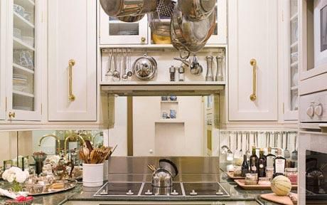 這款廚房它具有一張非常純凈的外表。櫥柜臺面采用精細打磨的卡拉拉大理石制成。灶具具有六檔火力調節(jié)。最出彩的在于對抽油煙機的設計,通過白色瓷磚砌成的墻面精細的包裹住油煙機,并在墻面上開鑿了擺放調料等的儲物架既美觀又實用。