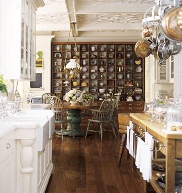 在這個空間里融匯了古代與現代的雙重元素?,F代簡潔的白色櫥柜與古董橡木櫥柜相應成趣。古銅餐桌與寫滿滄桑的鐵藝座椅述說著歷史的韻味。一面古董陳列架更是為整個廚房空間增添了時光輪回的感覺。