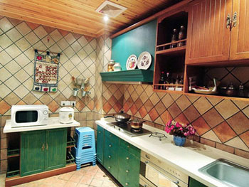在這種色彩環(huán)境里,可以清爽為主導(dǎo)。鄉(xiāng)土氣息的顏色搭配讓人神清氣爽。相比于地面,墻面顯然有更大的發(fā)揮余地,因此是最好的表現(xiàn)場(chǎng)所。圖案是調(diào)制田園味道不可缺少的組成部分,精美圖案的組織安排,四方聯(lián)的整塊使用或二方聯(lián)的連續(xù)使用都會(huì)很容易被人接受。明亮的空間是讓空氣感到清新的重要因素,顏色含灰度不能高,要始終保持一定的亮度。而高明度的原木色或略含灰度的藍(lán)綠色在色彩感覺(jué)上比較對(duì)味,也更適合廚房。